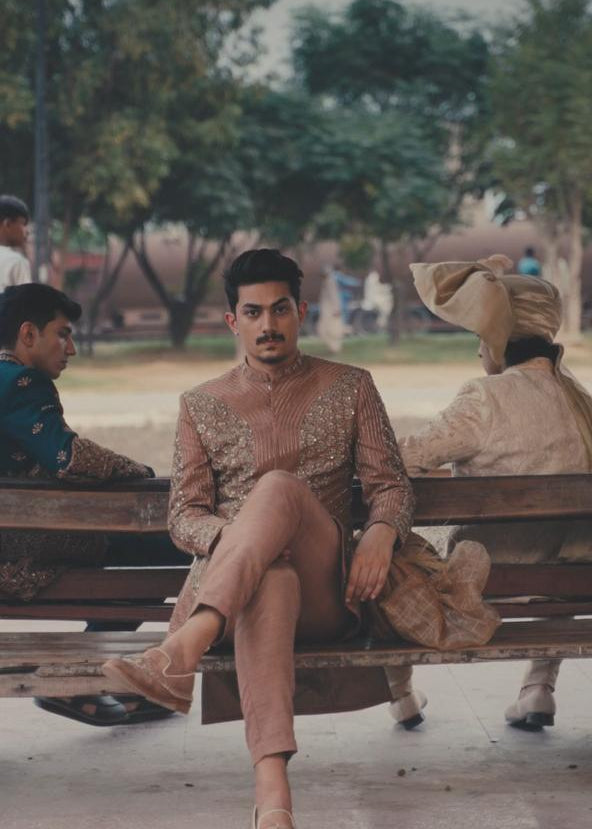 Zarposh celebrates the splendor of traditional couture through timeless craftsmanship. Rendered in an antique bronze tone, this sherwani is richly detailed with hand-applied zardozi and sequin artistry, reminiscent of royal ensembles from Pakistan’s golden era. A true statement of elegance — radiant, regal, and unforgettable.