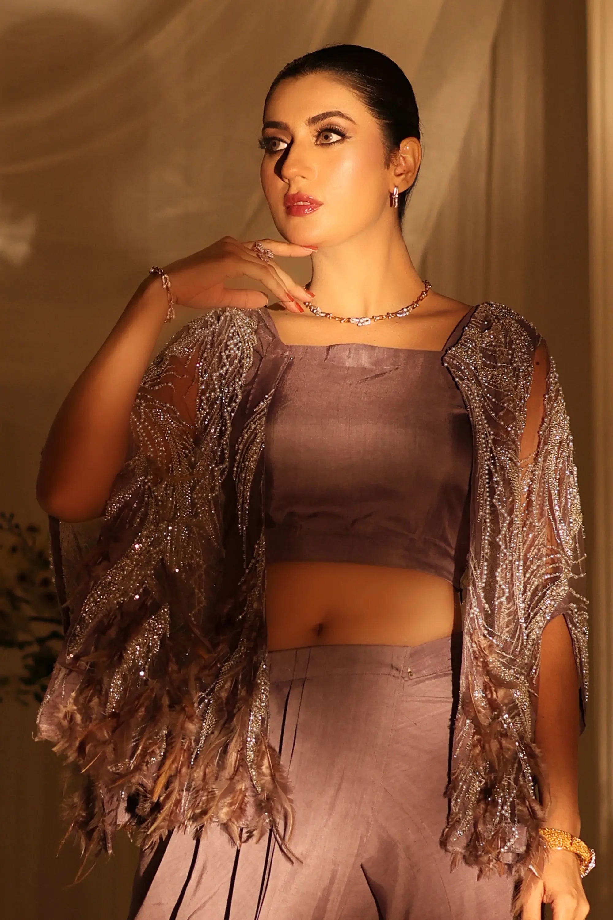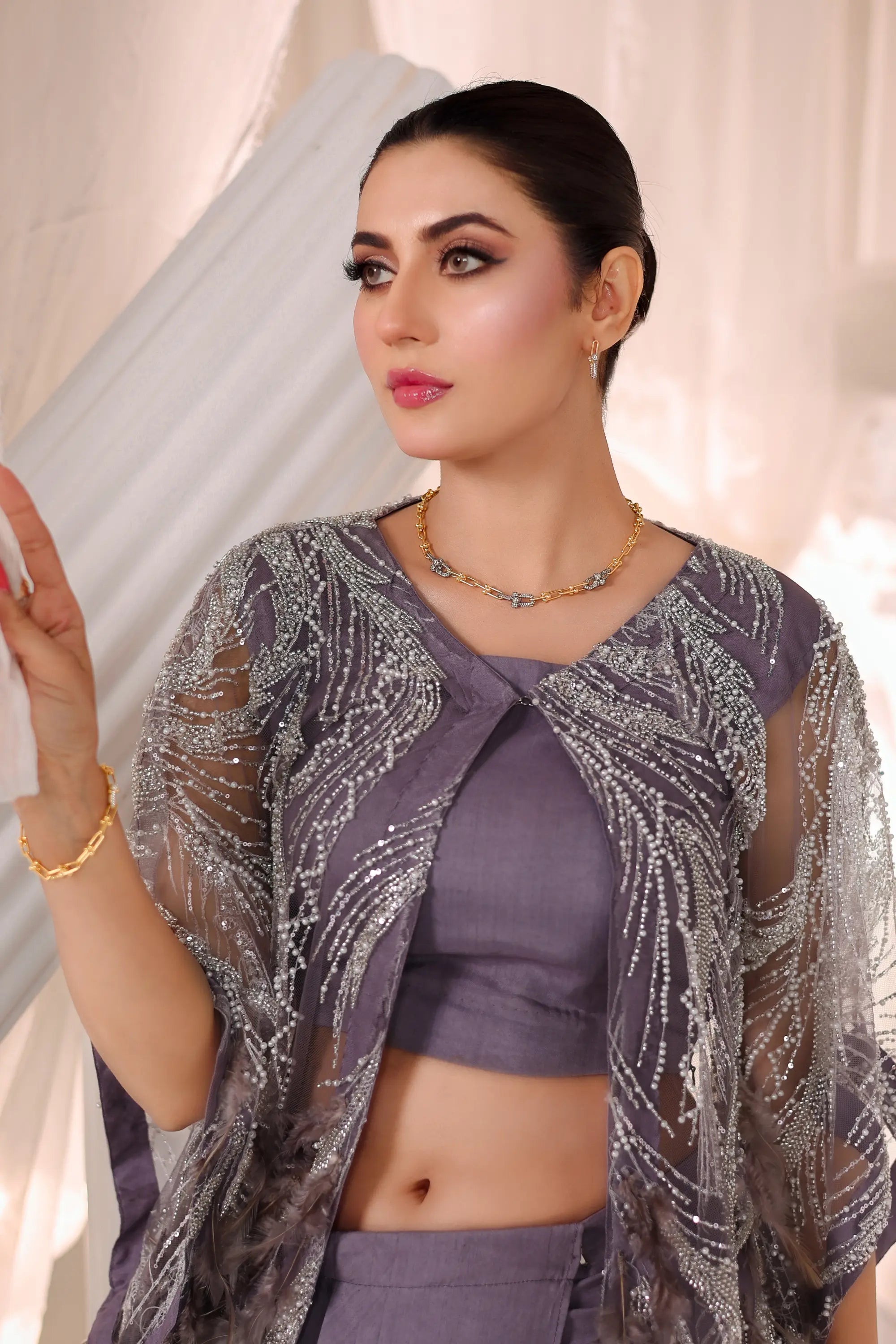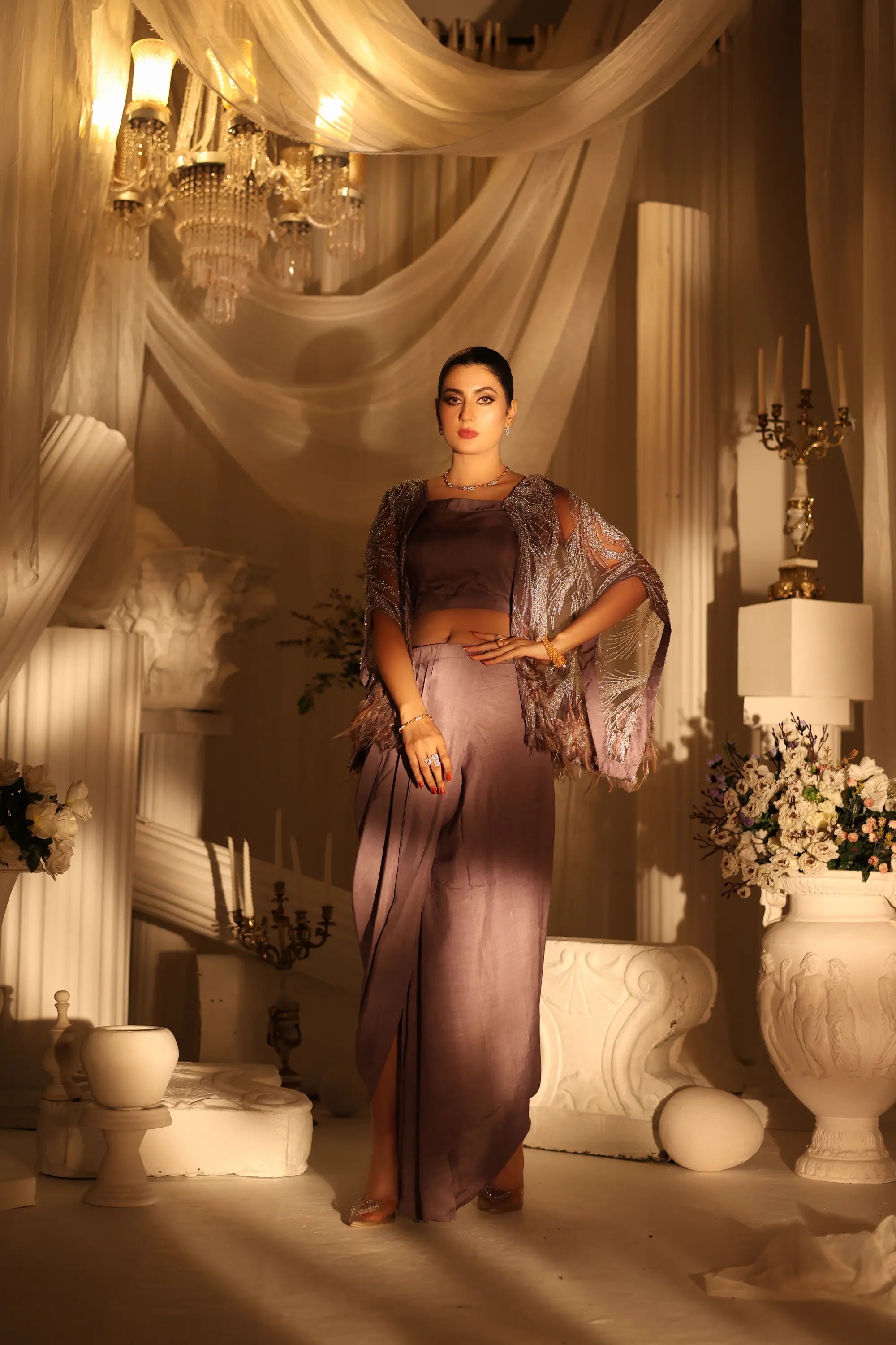 Grace meets modern allure in Ahsan Tariq’s Amara Drape Ensemble. This exquisite lavender two-piece features a contemporary draped skirt paired with a delicately embellished sheer cape, adorned with intricate silver threadwork and soft fringes. The cropped blouse adds a touch of elegance, balancing minimalism with opulence. Perfect for festive soirées, engagement events, or modern receptions — this look captures timeless femininity with a bold, couture edge.