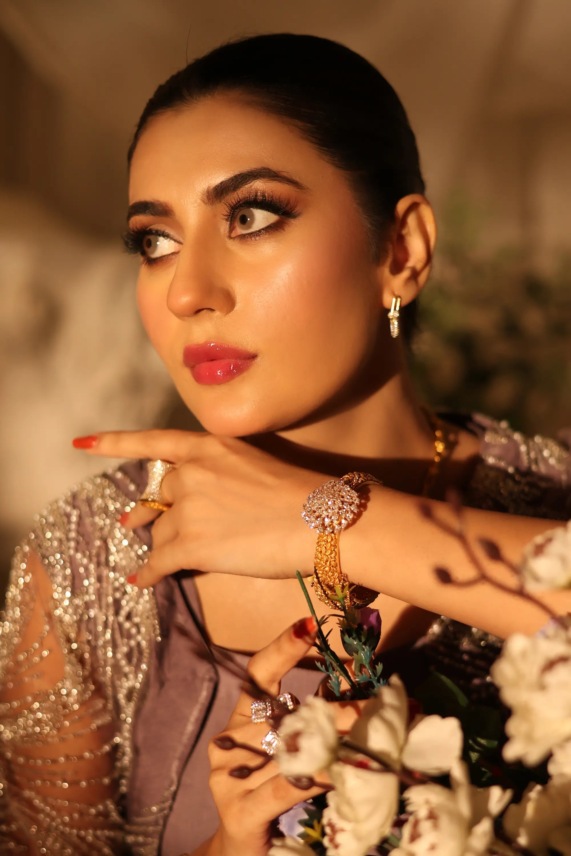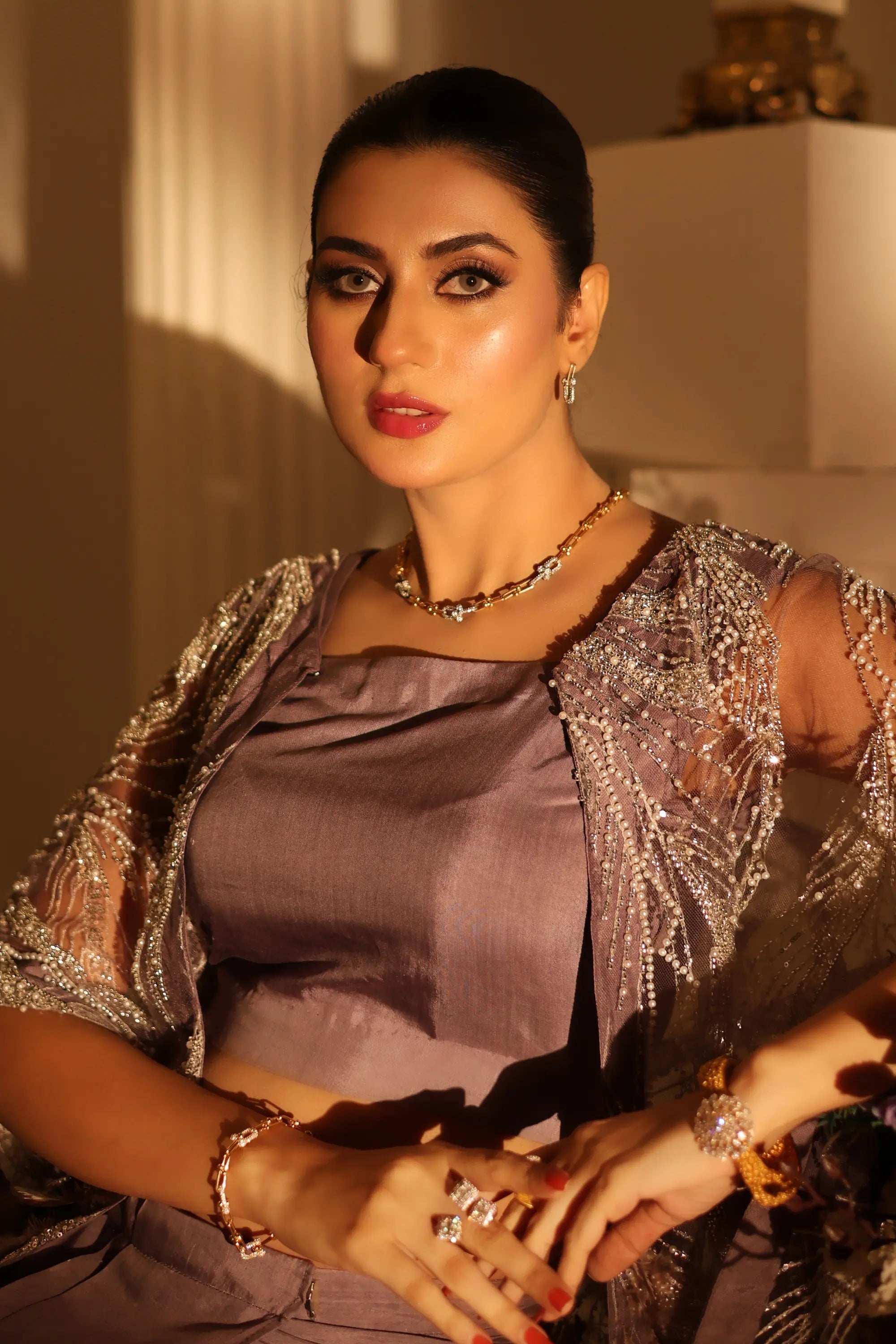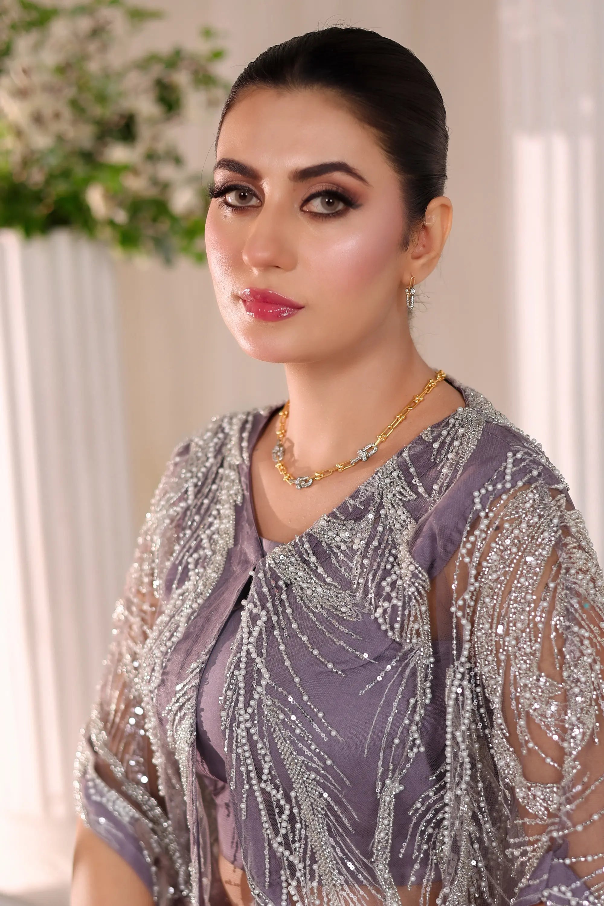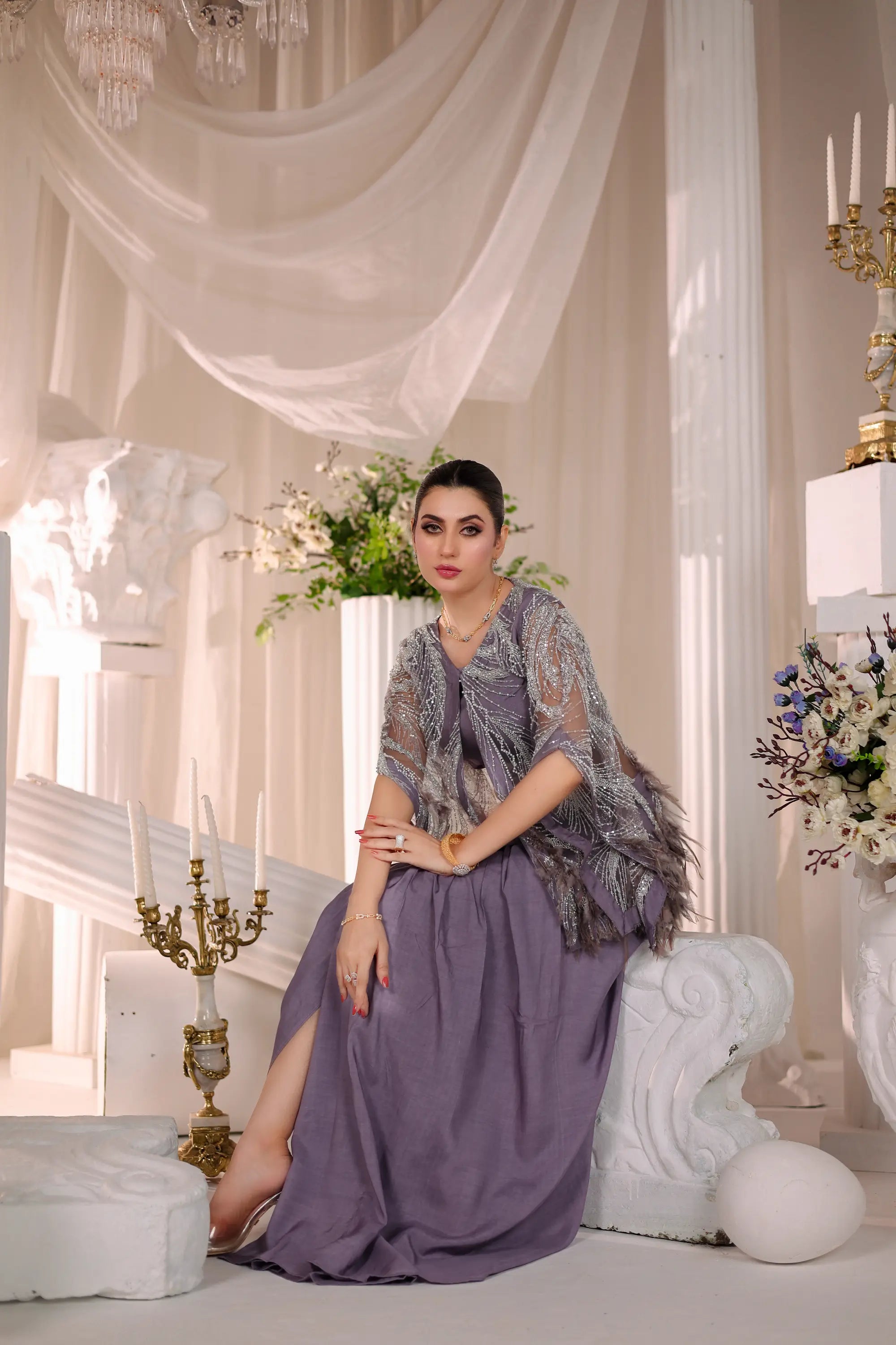 Grace meets modern allure in Ahsan Tariq’s Amara Drape Ensemble. This exquisite lavender two-piece features a contemporary draped skirt paired with a delicately embellished sheer cape, adorned with intricate silver threadwork and soft fringes. The cropped blouse adds a touch of elegance, balancing minimalism with opulence. Perfect for festive soirées, engagement events, or modern receptions — this look captures timeless femininity with a bold, couture edge.
