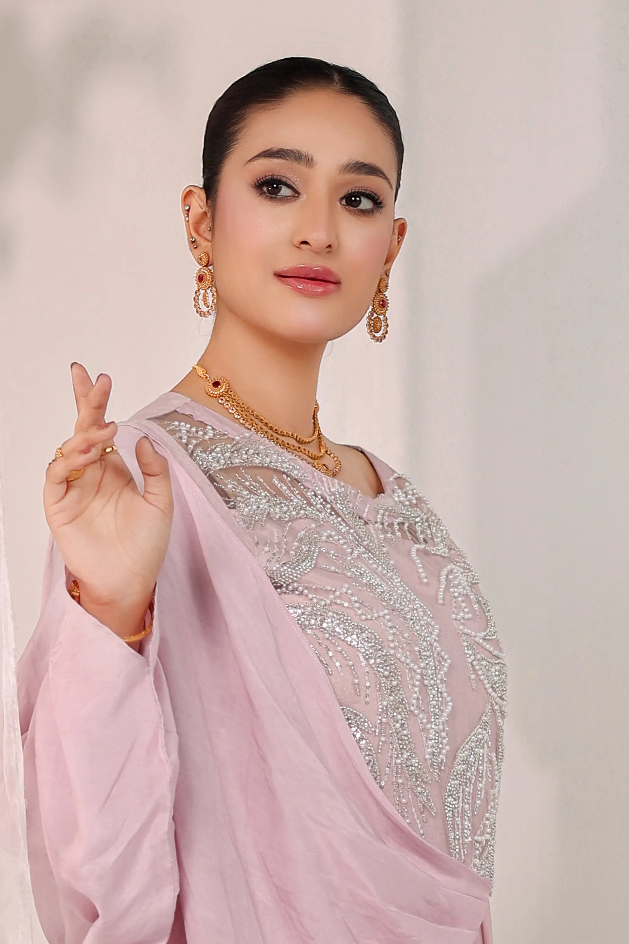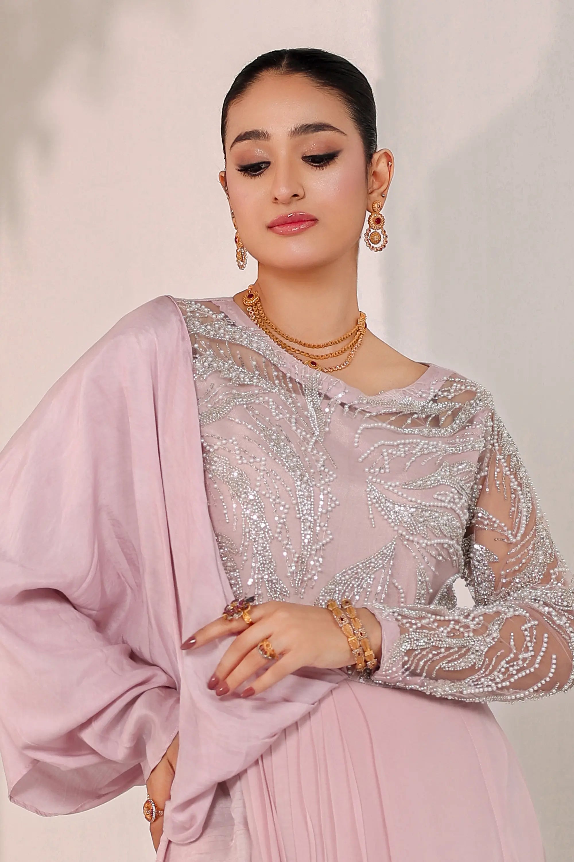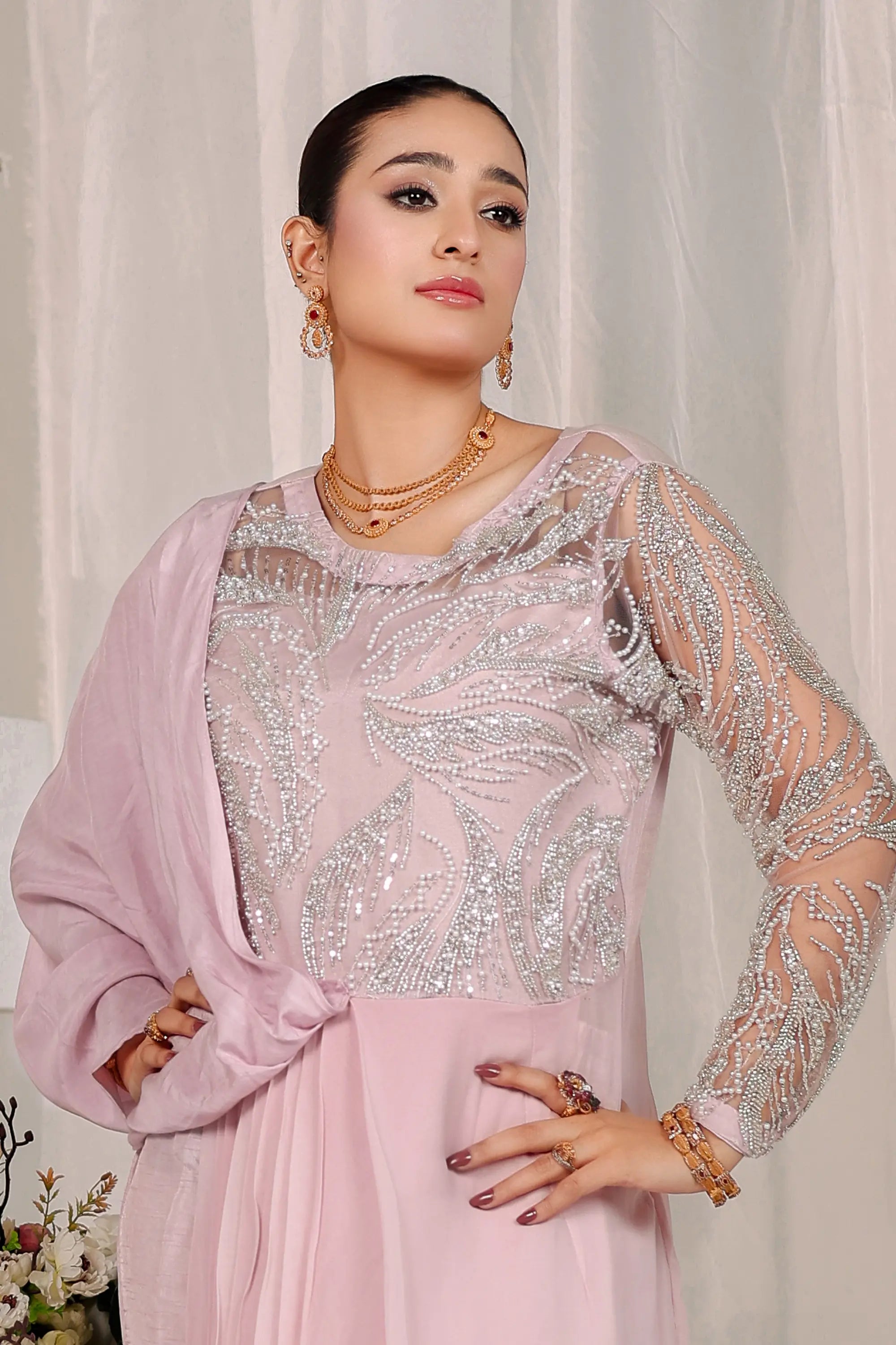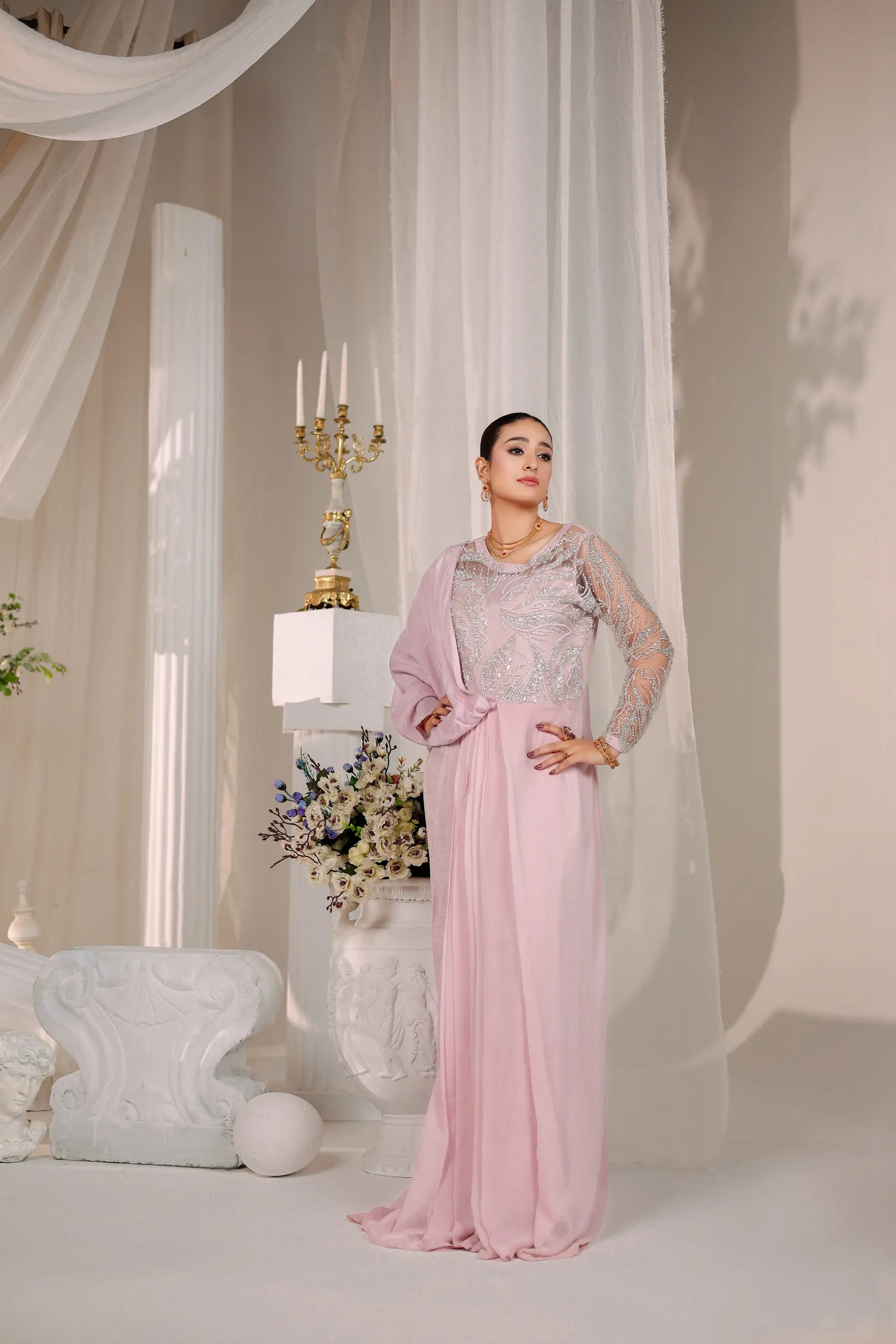 A vision of grace and sophistication, Blush Opulence by Ahsan Tariq features a soft blush pink ensemble adorned with intricate silver embellishments. The delicately hand-embroidered bodice, crafted with shimmering sequins and crystal work, flows into a fluid chiffon drape that exudes effortless femininity. The sheer embellished sleeves add a touch of modern elegance, while the structured silhouette maintains a regal poise. Perfect for evening soirées or formal celebrations, this look embodies timeless charm and contemporary allure.
