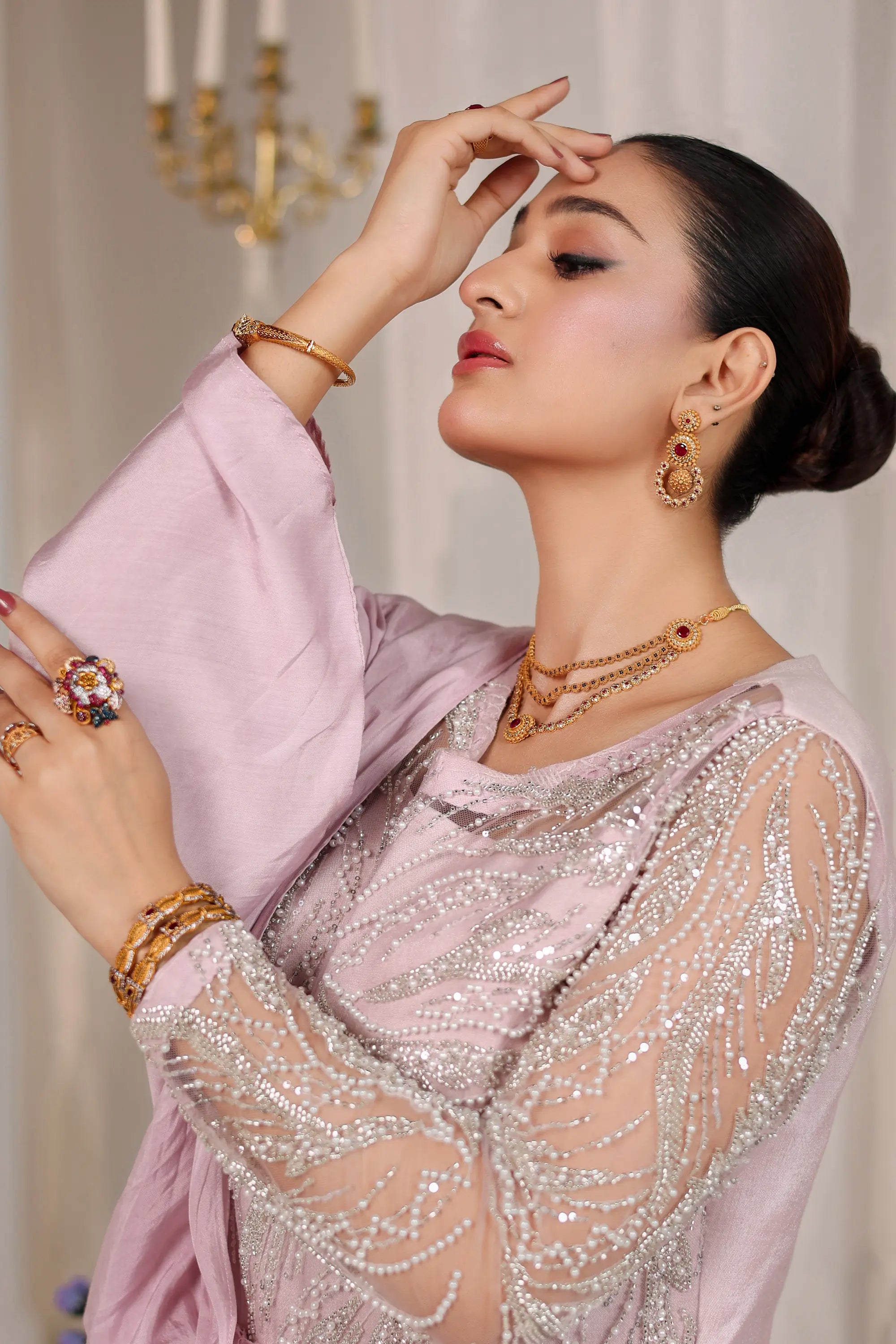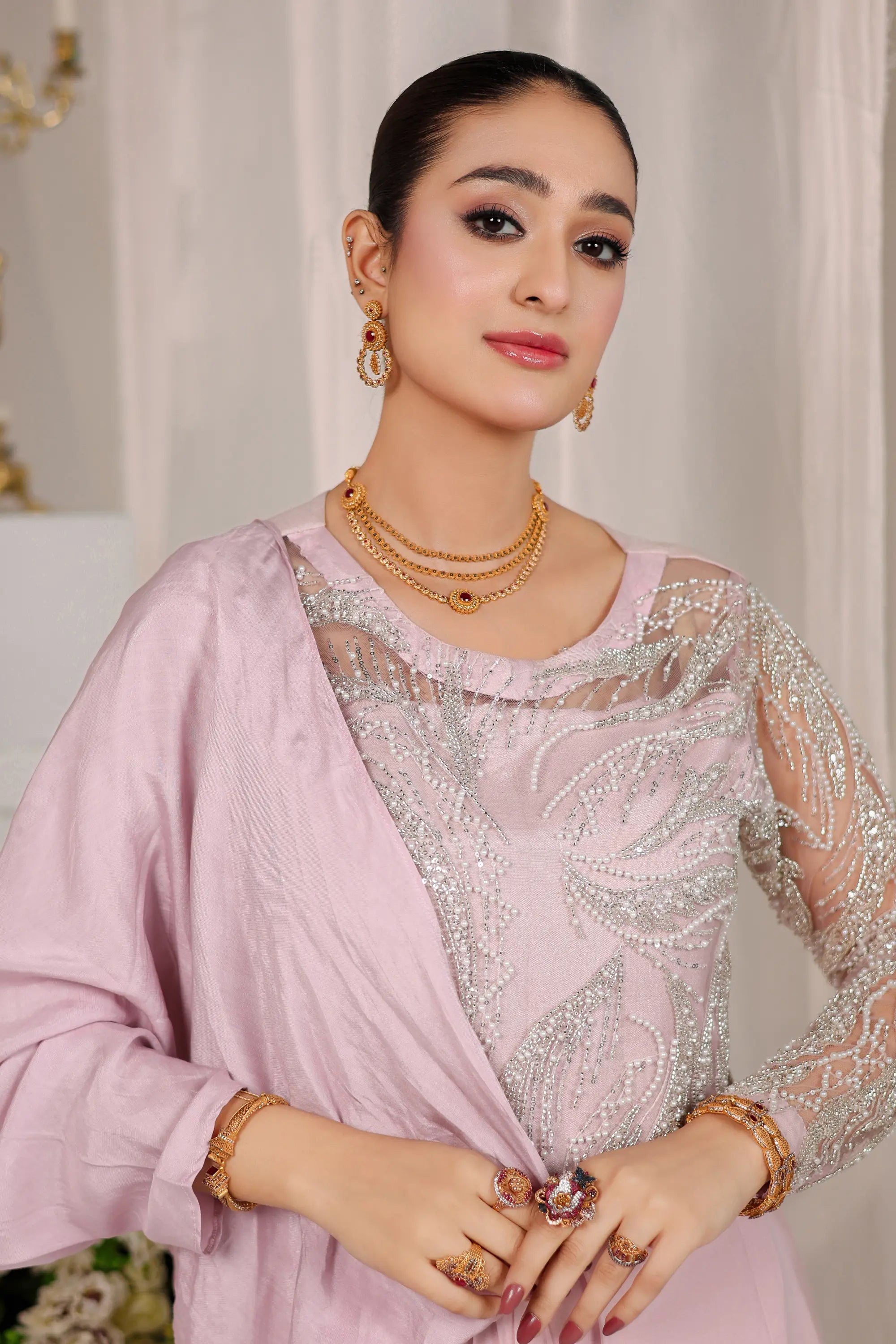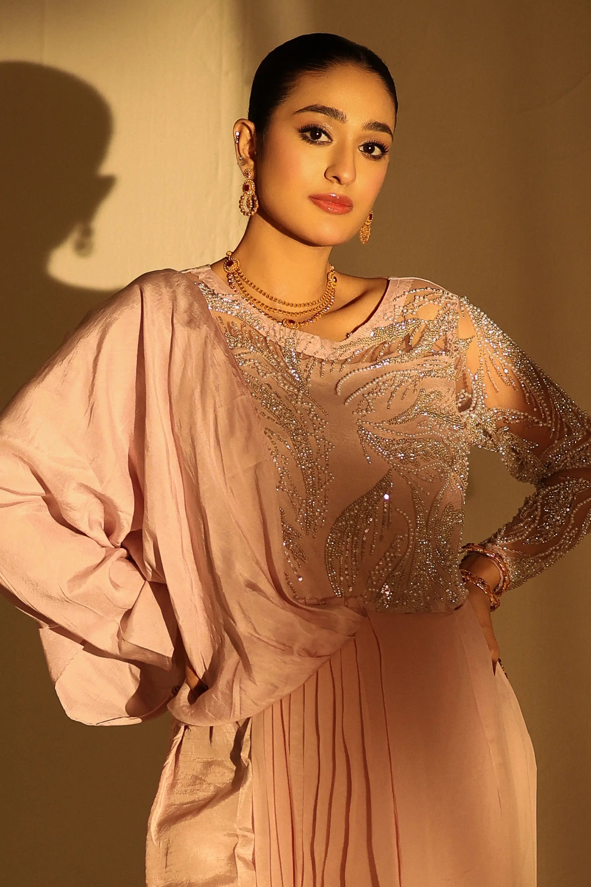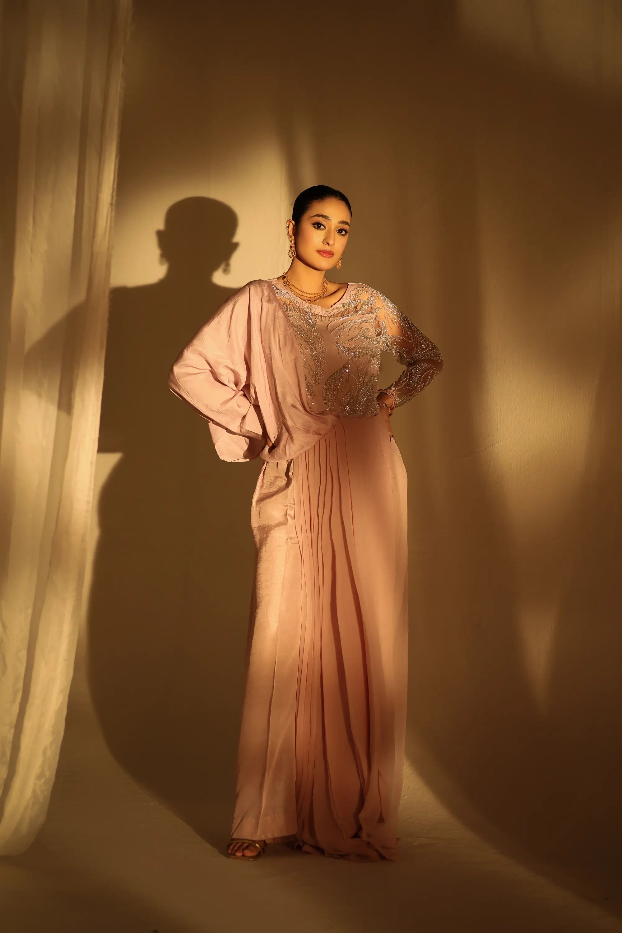 A vision of grace and sophistication, Blush Opulence by Ahsan Tariq features a soft blush pink ensemble adorned with intricate silver embellishments. The delicately hand-embroidered bodice, crafted with shimmering sequins and crystal work, flows into a fluid chiffon drape that exudes effortless femininity. The sheer embellished sleeves add a touch of modern elegance, while the structured silhouette maintains a regal poise. Perfect for evening soirées or formal celebrations, this look embodies timeless charm and contemporary allure.