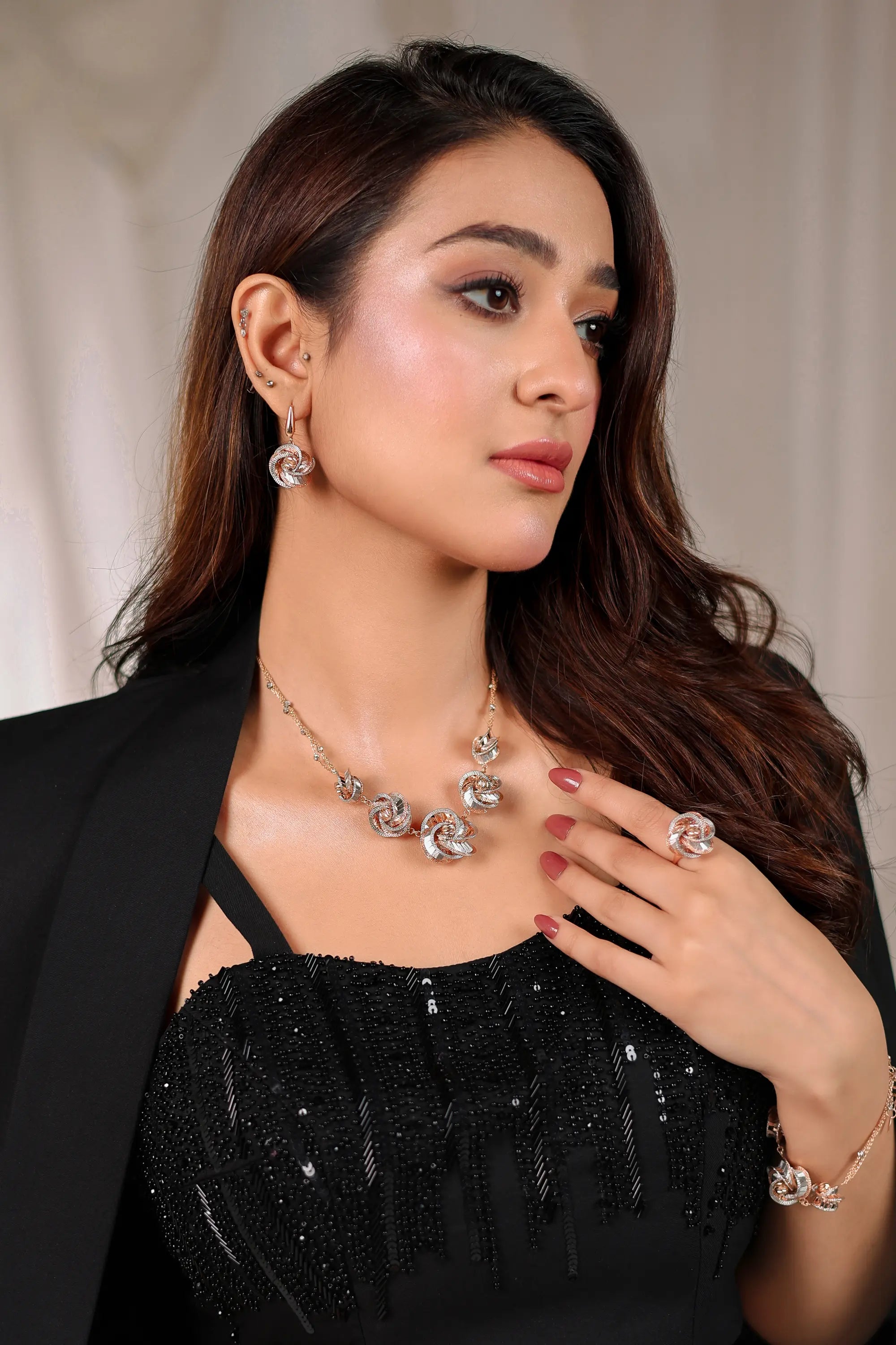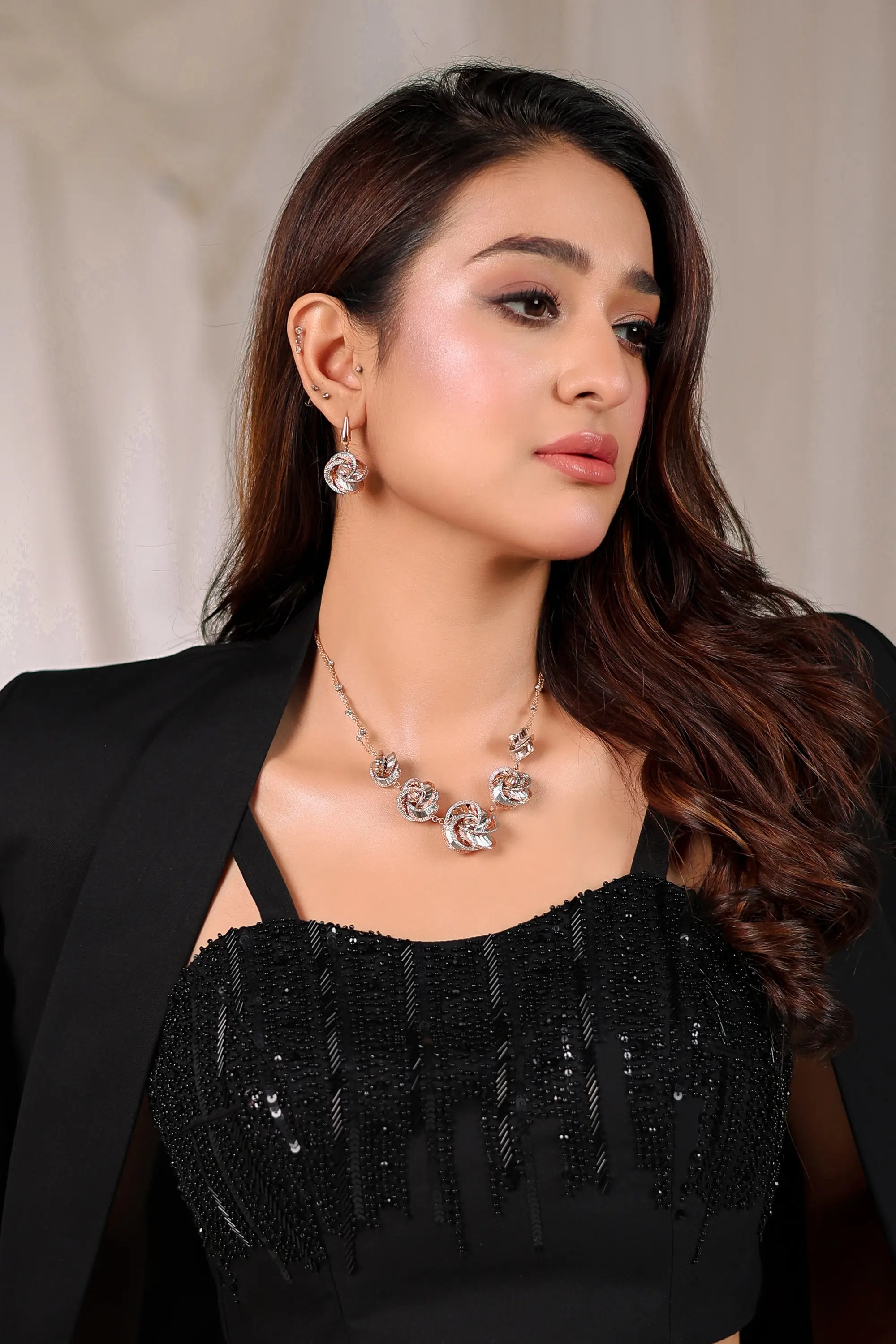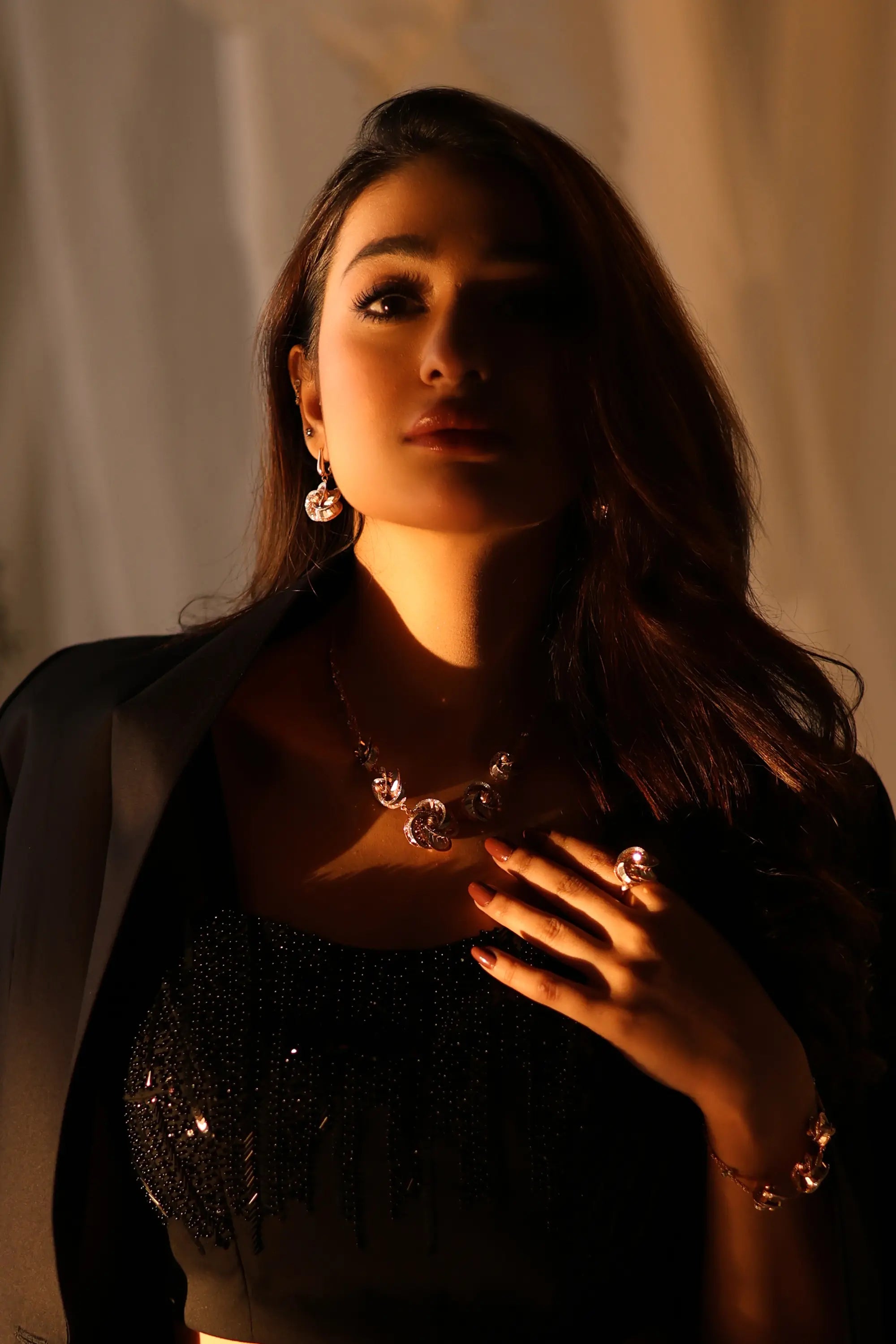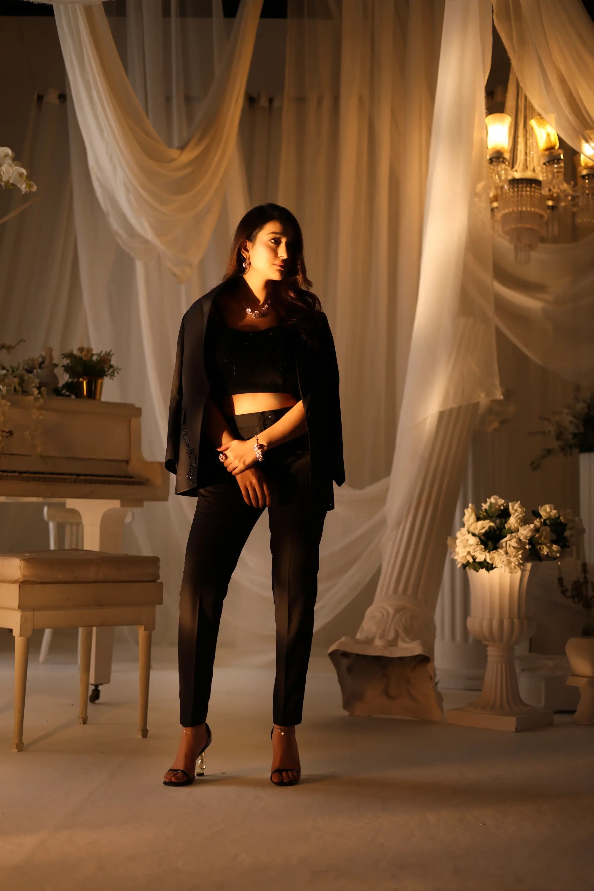 Commanding sophistication with a modern edge, Noir Éclat by Ahsan Tariq is a masterclass in timeless elegance. The sleek black tailored suit features a delicately hand-embellished cropped top paired with structured trousers, creating a perfect harmony of power and allure. The jacket, detailed with subtle tonal beadwork, adds a touch of understated glamour. Ideal for evening galas or couture soirées, this ensemble celebrates the confident woman who owns every room she enters with effortless poise.