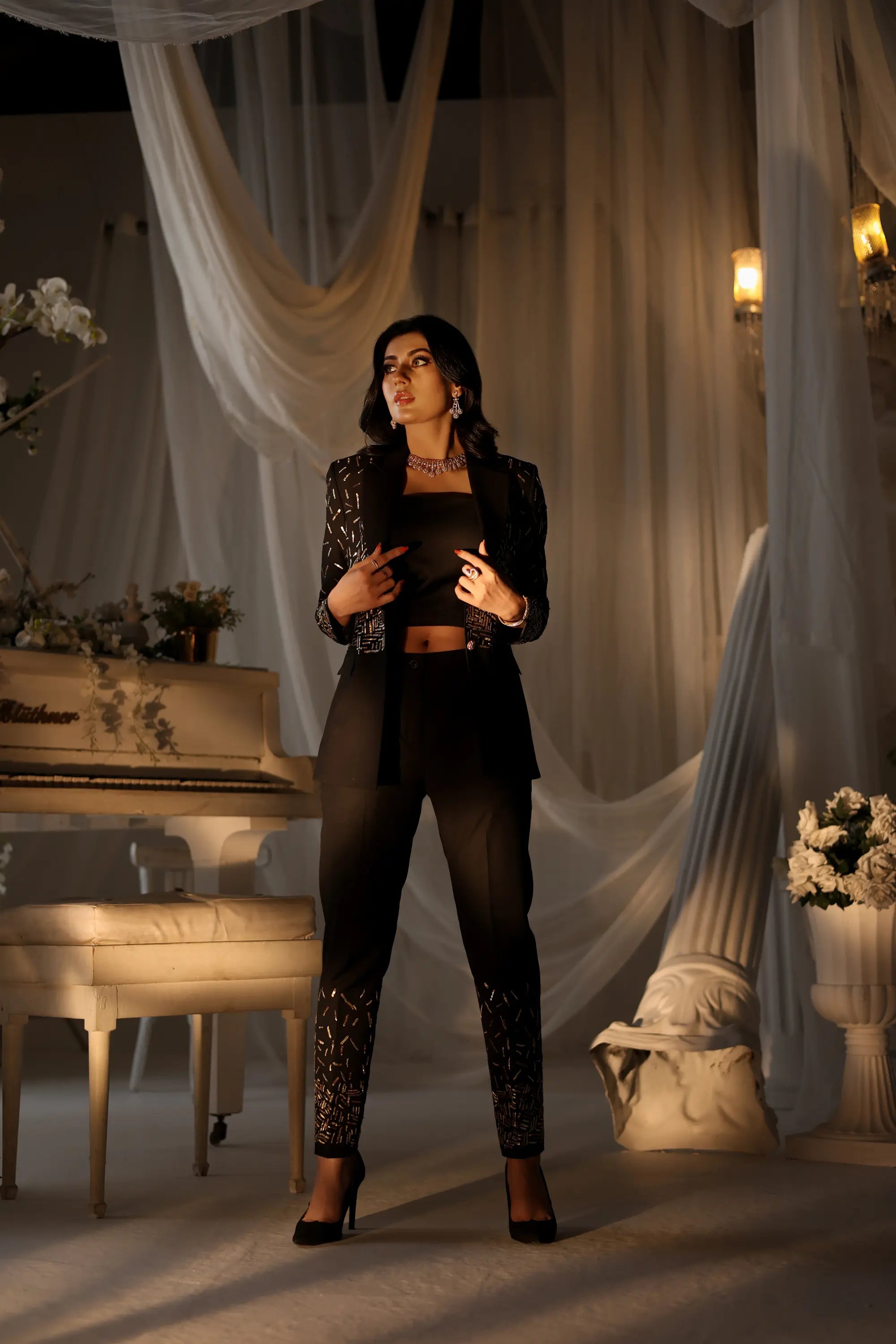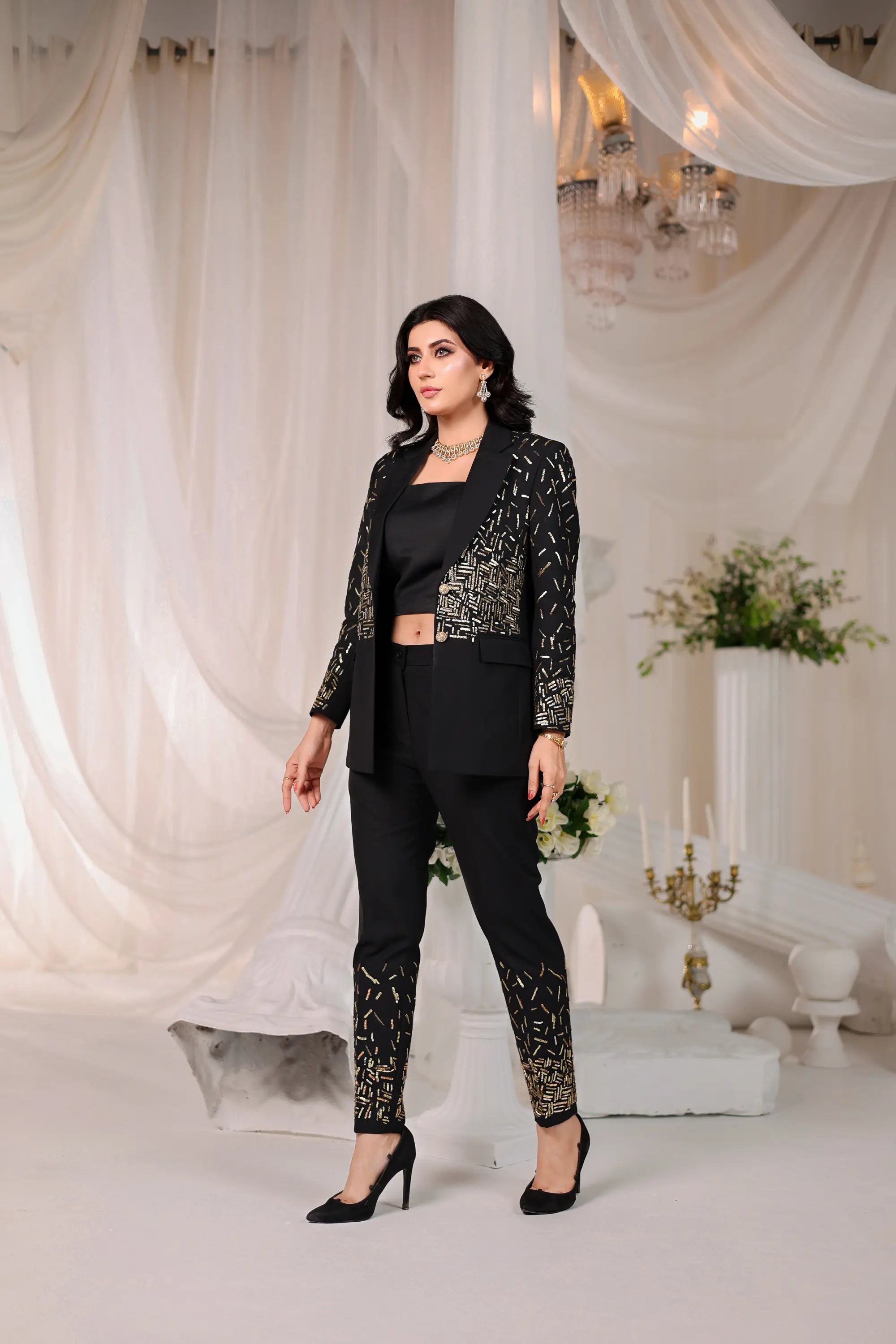 The Noir Luxe Ensemble redefines power dressing with a couture twist. Crafted in jet-black suiting fabric, this striking outfit features a tailored blazer adorned with intricate gold embellishments — a fusion of geometry and glamour. The straight-cut trousers mirror the same ornate detailing at the hem, creating a harmonious balance of structure and sophistication. Paired with a sleek black inner and statement heels, this look is the perfect blend of modern femininity and timeless elegance — ideal for evening soirées, formal dinners, or festive gatherings.